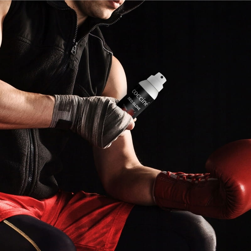 Silny i skuteczny dezodorant do utrzymywania higieny rękawic bokserskich, ochraniaczy i innych akcesoriów sportowych, które mają kontakt ze spoconą skórą podczas wysiłku fizycznego.