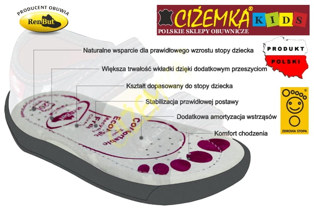 W obuwiu marki RenBut zastosowano specjalne wkładki z skóry pozbawionej CHROMU VI i pianki lateksowej, która zawiera aktywny węgiel drzewny. Dzięki temu wkładki posiadają właściwości oraz zapewniają doskonałe wchłanianie potu. Dodatkowo świetnie amortyzuje wstrząsy podczas chodzenia przynosząc ulgę zmęczonym stopom, a odpowiednio wyprofilowany kształt wkładki zapewnia właściwą stabilizację stopy.