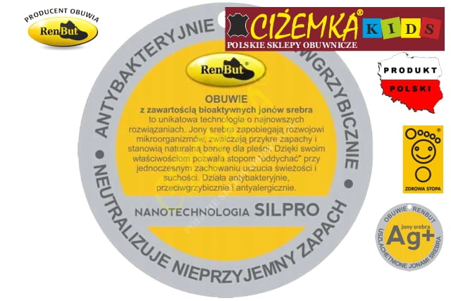 W obuwiu marki RenBut zastosowano specjalne wkładki z skóry pozbawionej CHROMU VI i pianki lateksowej, która zawiera aktywny węgiel drzewny. Dzięki temu wkładki posiadają właściwości oraz zapewniają doskonałe wchłanianie potu. Dodatkowo świetnie amortyzuje wstrząsy podczas chodzenia przynosząc ulgę zmęczonym stopom, a odpowiednio wyprofilowany kształt wkładki zapewnia właściwą stabilizację stopy.